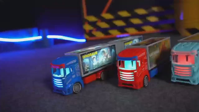 Dynamic LED Screen & Lights: The cargo trailer features a vibrant LED screen that displays captivating images (like the dinosaurs or Spiderman shown) and bright lighting effects on the cab. Play day or night and enjoy the spectacular light show.